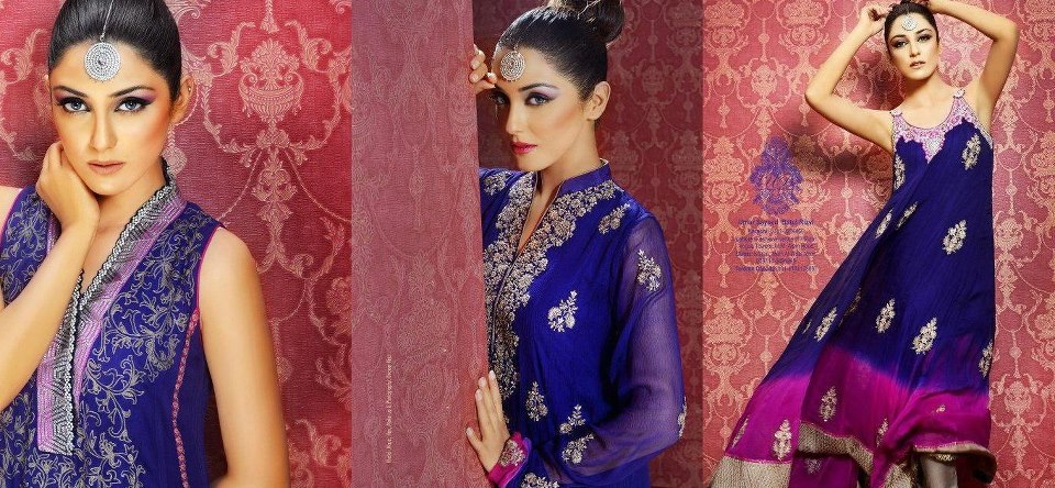 Sonakshi Sinha wore a floor grazing Blue Designer Frock with a sweetheart neckline. Her waist was accentuated with a broad band of zardozi embroidery, as were the cuffs. The bright pink and gold border really made this dress stand out a mile along with a flowing blue dupatta.