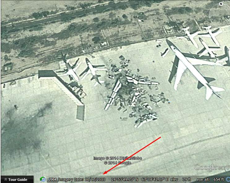 Please look at the bottom of the picture in this image, which is from 17 November 2013 you can check this date on Google Earth. Also, the aircraft in the image that seems destroyed was in fact an old PIA 747 (AP-BFY), which was scrapped/dismantled after being retired.