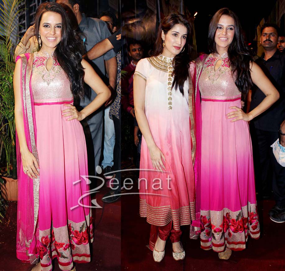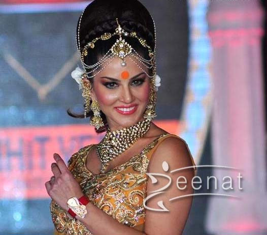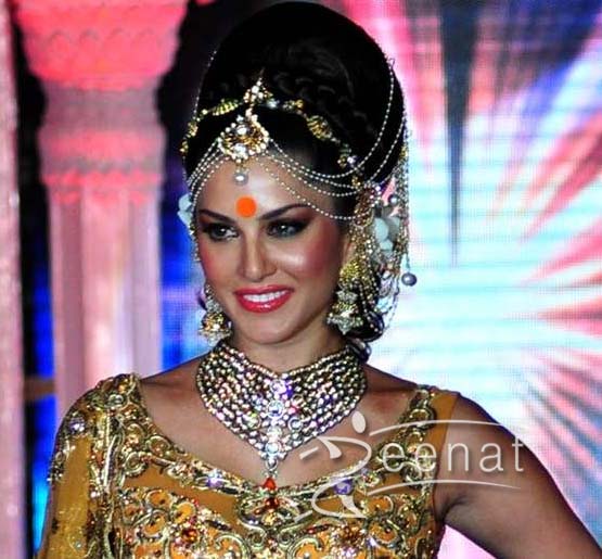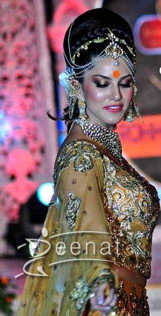Sunny Leone – The hottie was dressed in a mango yellow Lehenga Choli designed by Rohit Verma which was heavily embellished with gold embroidery and semi-precious stones. The choli featured sheer fabric on the straps and lower half with lining along the bust to maintain her modesty. She wore heavy, traditional Indian jewellery to accessorize from jhumkas and necklace to elaborate hair accessories.
